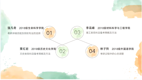 最后,主持人李高峰对书院优秀学子们的分享和学弟学妹的参与表达了衷心的感谢。同时,他也预祝各位学弟学妹们在考研的过程中大放异彩,通过自己辛勤的汗水换来丰硕的成果。本次考研分享会三位优秀学子细致入微地分享了自己考研成功的经验,并结合了自己的大学生活和宝贵经历解答了大家心中的疑问,给大家带来了一场十分精彩的分享会。