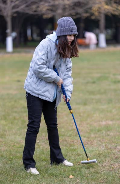 在门球比赛开始之前,由教练说明游戏规则、正确击球方式和注意事项。听完介绍,同学们一个个都跃跃欲试,在草坪上练习起来。