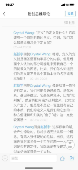 石碧球老师的《西方哲学的世界》一课,同样是以录课方式进行,其课堂的讨论氛围较之中哲课是有增无减。石老师注重培养学生的思维能力,他在录课音频中引领大家梳理了哲学的基本问题、可能旨趣、做哲学几种路向。课前已经完成观看任务的同学们成为了课堂的主角,他们出于对哲学的浓厚兴趣,从对课程的理解到自己疑惑的具体问题,在微信群中几分钟内会有十余名同学发问,石老师对其进行解答,助教作补充,其他同学也尝试互动解答,群内消息非常密集,几乎所有同学都参与讨论,如此热情高涨,使得一堂课有时甚至会延长至4-5个小时。这样的云端教学不仅没有拉开师生的距离,反而给大家提供更充分的交流空间。