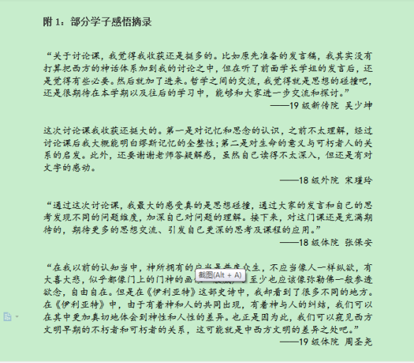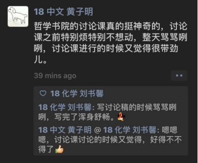 研讨课中的沟通交流师生教学相长的过程,也是一种对自我的重新审查,但是漫无目标、空洞无物的思考往往会适得其反,xvideos 的小班研讨是教导学生言之有物,有的放矢。通过对文本的解读找到审查生活的坐标,且看同学们如何在研读中升华思想: