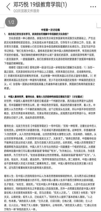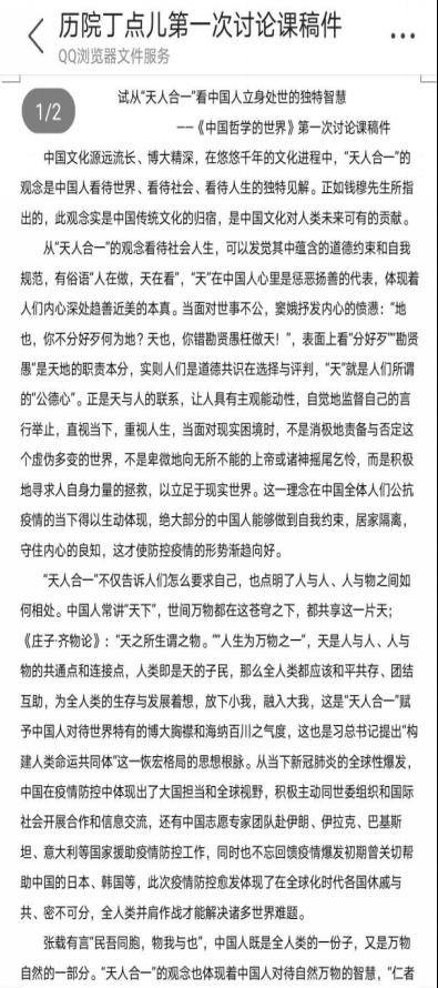 2020年春季学期《中国哲学的世界》第一次线上讨论课于第六周在腾讯会议进行。本次讨论课的主题是“文化自信”,要求大家思考“如何理解中华民族的文化自信?中国人看待世界、看待社会、看待人生的独特性体现在哪些方面?在新时代如何更好地彰显中华文化的特色与魅力?”这三个问题。每位同学都在参加讨论之前交了自己的讨论稿,助教审核讨论稿并对同学们的讨论稿提出修改意见。从讨论稿的内容来看,大多数同学都能结合开课以来学习的知识,如儒释道三教合流、天人合一、天下无外、民胞物等中哲知识;并积极参考其他方面的资料,还能对讨论主题进行独立思考,讨论稿总体质量令人满意。