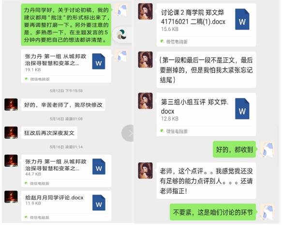 引入互评,往来相应。本次讨论在形式上仍然以每位同学做主题发言为主,后留短时间的自由讨论为辅。本次讨论课引入了“组内同学互评”的环节,尤其第一、第三组落实在文字稿上,效果良好,讨论中批评回应皆有往来。