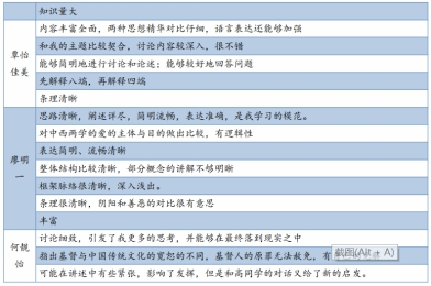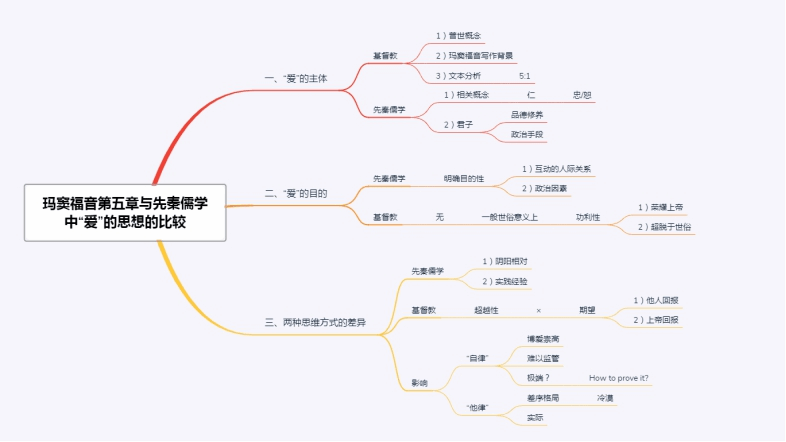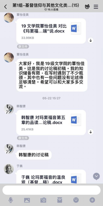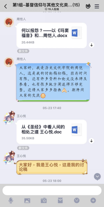 切磋呈文化之多元。第一组以“基督信仰与其他文化类型的比较”为主题,主要涉及基督教思想和其他观念在如何爱人等问题上的不同态度等。在讨论课正式开始前,各小组的成员已将讨论稿发至群中,供组员提前了解,在吸取助教和组员的意见之后,同学们对其观点进行反复修改,逐渐完善。