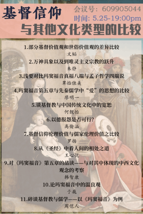 2020年5月25日晚,本学期《基督宗教与西方文明》第二轮第一组讨论课在腾讯会议平台顺利召开。本次讨论课以《新约》中《玛窦福音》第五章的内容为主题,该部分较为集中地表达了基督宗教在价值伦理方面对信徒作出的要求,与世俗价值观有着较直接的冲突。对该部分内容的探究和了解,有助于同学们更为具体、深入地“走近”基督教文化的堂奥,拓宽关于世界、人生、伦理等问题的思考路径。