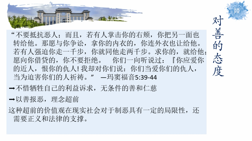 议论发思想之曲奥。讨论课的正式开始则在知己知彼的氛围中展开,同学们可以有的放矢的对互相的论点进行充分讨论。第一位登场的文韬同学比较了基督教价值观和世俗价值观在对待“知识和财富”、“愤怒”和“”三个话题上的不同立场,并解释了造成这些差异的原因在于二者的动力来源和归宿不同。这个极具张力的主题引发了同学们的热议。周恺人同学就此提出,基督信仰也有指向自身特定诉求的一面,并不是完全“利他”的;基督教之所以奉行不还击、默默忍受的“真仁义”,是因为把希望寄托在了死后的荣耀。覃怡佳美同学提出了自己的困惑:基督信仰所推崇的“善”究竟是有一定原则的,还是无差别地逆来顺受或纵容恶行?宗老师对此作出了解答:基督信仰所吁求的是“以善报恶”,强调的是坚持的绝对的“善”的原则,即使面对邪恶也绝不屈服。因此,对待恶行的态度既不是无差别、无底线的纵容,也不是屈服于邪恶的诱惑,“以恶制恶”。