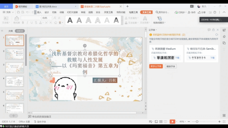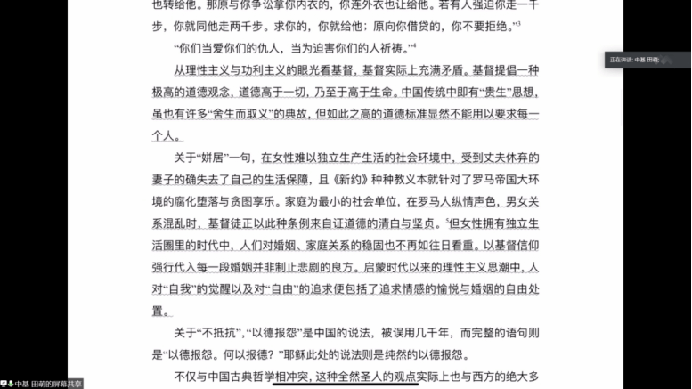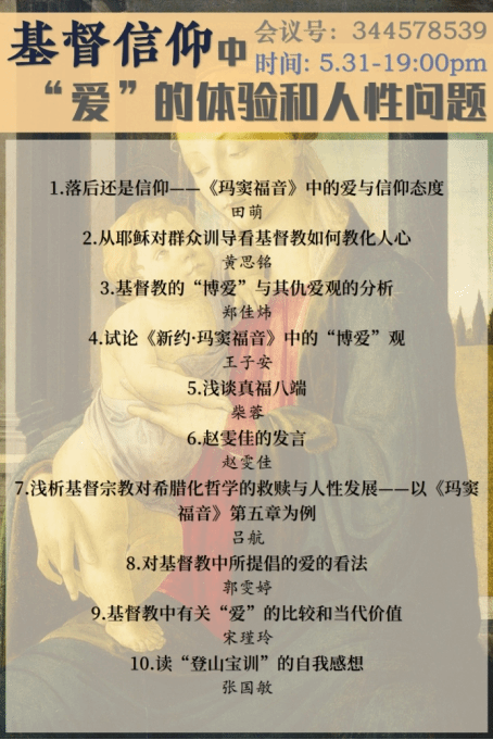 5月31日晚,本轮第三组讨论课在腾讯会议如期举行。讨论开始前,宗晓兰老师向组员们介绍了本次讨论主题文本的背景情况。她强调,《圣经》中《旧约》与《新约》两部分是密切关联的,《旧约》是《新约》的预表,《新约》是《旧约》的成全。《新约》中的福音书讲述了耶稣的故事。作为本次讨论课主题的《玛窦福音》第五章集中地阐述了耶稣对信徒的教导,既是基督信徒应该遵守的价值准则,也是基督教观念中天国子民应该具备的素质。针对本组主题——“基督信仰中爱的体验和人性问题”,宗老师指出,耶稣给出的诫训虽然不合乎“情”,不合乎“理”,但合乎爱的原则,这也是基督信仰的核心要义。宗老师对同学们提交的讨论稿予以赞肯,认为大家围绕着文本从各方面作了讨论,表达了自己认真的思考,更谈出了自己独特的看法。