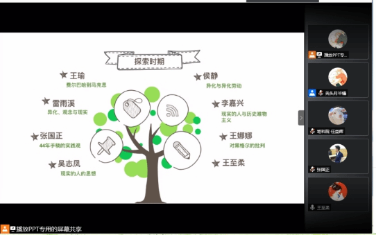 探索时期组则侧重于异化劳动、现实的人、实践观和历史唯物主义的形成。雷雨溪同学利用马克思讲述的笑话和泰坦尼克号的调查切入主题,从分析观念与现实的矛盾来阐述自己对异化的理解,其风趣的语言描述让同学们感受到了一种独居风格的文字魅力,观点新颖论述新奇,非常精彩;王至柔同学从扬弃异化与人与自然的角度阐释异化理论,并在此基础上反思自己,反思现实世界和现实的人,做了一次非常有意义地理论与现实相结合的尝试;吴志凤同学则借由“现实的人”思想形成、内涵的思索来重新审视异化劳动问题并分析其现实意义等。