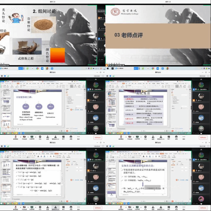 哲学系王晶老师负责讲授。临近期末,《批判性思维与哲学论证》这门课程继续遵循校院“如无必要不返校”的要求,在书院的领导下,有条不紊地开展着线上教学工作,照常推进教学计划。根据课程讲授计划安排,本课程的第三次讨论课于6月14日(星期日)在腾讯会议上成功举办,本次讨论课的主题为:模糊性与连锁悖论,长安与雁塔两个校区班的各年级、各专业的选课同学全员参加。
