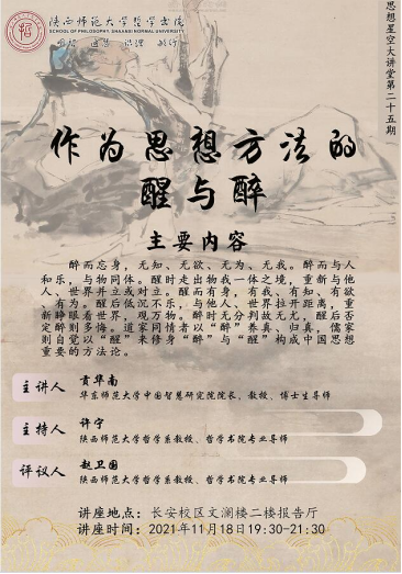 醉而忘身,无知、无欲、无为、无我。醉而与人和乐,与物同体。醒时走出物我一体之境,重新与他人、世界并立或对立。醒而有身,有我、有知、有欲、有为。醒后低沉不乐,与他人、世界拉开距离,重新睁眼看世界,观万物。醉时无分判故无尤,醒后否定醉则多悔。道家同情者以“醉”养真、归真,儒家则自觉以“醒”来修身。“醉”与“醒”构成中国思想重要的方法论。