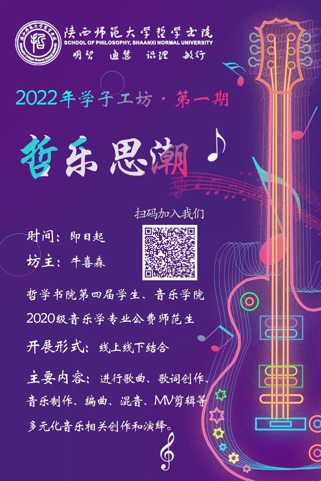 哲乐思潮工坊旨在为同学们搭建完备良好的音乐交流平台,聚集一群热爱音乐、热爱创作的书院同学,营造轻松自由的互动氛围。在这里,大家可以组织乐队也可以进行歌曲创作、歌词创作、音乐制作、编曲、混音、MV剪辑等多元化音乐、歌曲相关创作和演绎,书写正能量的歌曲,传播音乐的“真、善、美”,用青年人的朝气、热情、梦想谱写出一段段美妙的音乐。