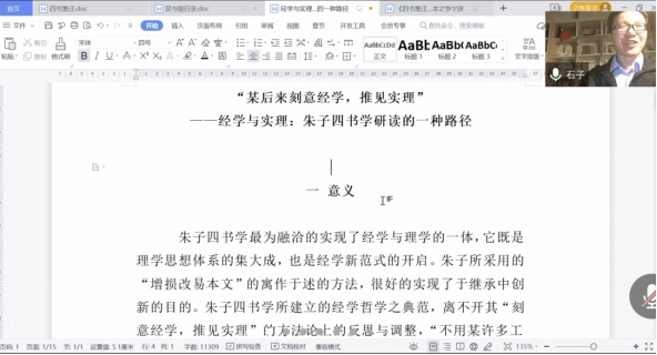 许老师表明自己在撰写《经学与实理:朱子四书学研究》一书时,遵循了“以朱子解释朱子”的立场,将朱子四书的文本研读作为依托,从朱子固有的论题出发,采用朱子的治学方式,把忠实阐明朱子《四书》本意作为宗旨。之后他引用了汪子嵩先生的一段话,借此说明研究方法在哲学研究中的重要性。朱子正是在“刻意经学”之后“推见实理”,最终形成了自己的经学哲学。许老师认为朱子是“文本主义者”,重视对文本的“咀嚼”和“涵泳”却不囿于文本,反而能够超越文本。许老师以《周易》为例,指出朱子另辟蹊径找到以卜筮理解《周易》的角度,反而更能解得圣贤真意。许老师又举朱子批评二程只从义理角度阐释经学存在不足为例,显示朱子对形上义理与实践工夫相契合的推崇以及对章句之学的重视。