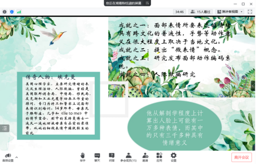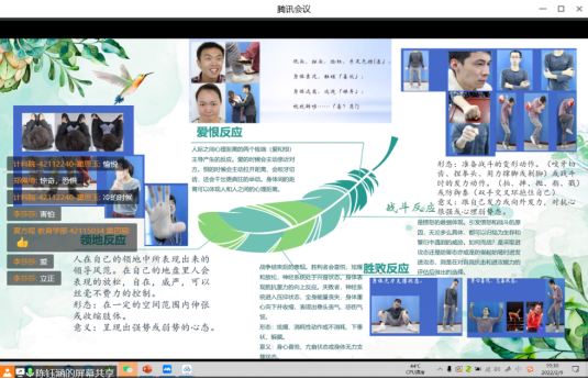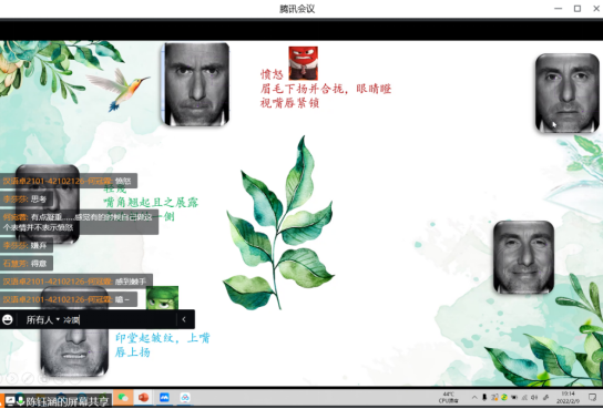 陈钰涵同学主要从微表情的由来及其原理、微表情的八大副语言行为等方面做了分享。微表情是指人们在受到外界刺激的一刹那,激发出的真实反映。美国心理学家埃克曼从解剖学角度计算出人脸上可能有一万多种表情,其中只有三千多种具有情绪意义。分享人给出不同微表情图片,同学们在评论区进行辨认,达到了很好的互动。