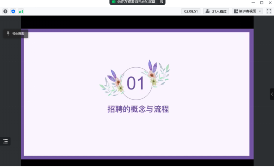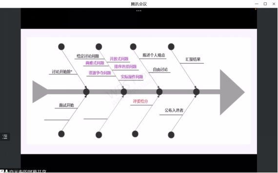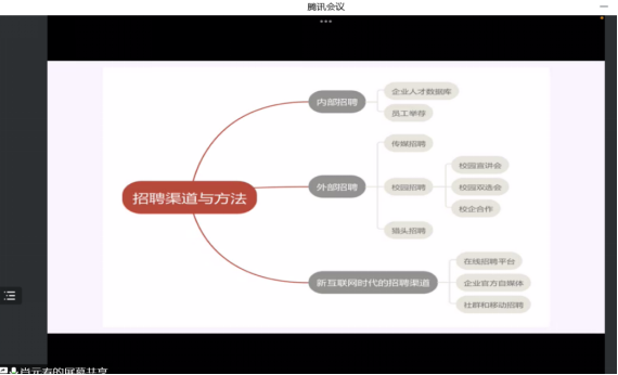 肖元寿同学为大家介绍了招聘渠道、方法与面试流程,其中具体讲解了无领导小组面试和技巧。他讲到,在小组讨论开始前要做好准备:建立专属的工作邮箱;在大家互相不认识的尴尬场面,可以带领大家做破冰小游戏;可积极站出来组织和引导讨论进行;大胆表达自己的观点;讨论过程中可以适时充当记录员,提醒大家时间和讨论进度。