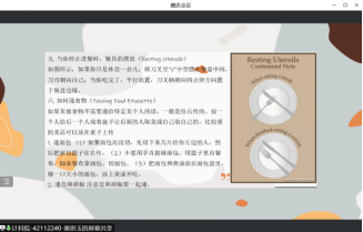 在社会电子通讯越来越发达的现代社会,人们正在失去面对面交流的能力。窦思玉同学从英国和中国对比出发,仔细介绍了英国国宴规格和餐桌礼仪。西方社会对社交礼仪十分重视,其可分为餐巾礼仪、餐具礼仪、点餐、入座等。此外窦思玉同学还从坐姿、饮茶等方面为大家介绍了英国下午茶礼仪。接着,窦同学介绍了中国的餐桌礼仪——宴请客人时主宾位置朝门,以左为尊。主宾先自觉入座,无长辈时女士优先。礼仪对我们来说,是一种在不知不觉中让别人感到舒服的方式。