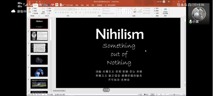 第三位分享者是来自外国语学院英语系2021级的夏妤茜同学。夏同学从宇宙论虚无主义的角度出发,为大家介绍了虚无主义出现的原因以及对待虚无主义的态度。