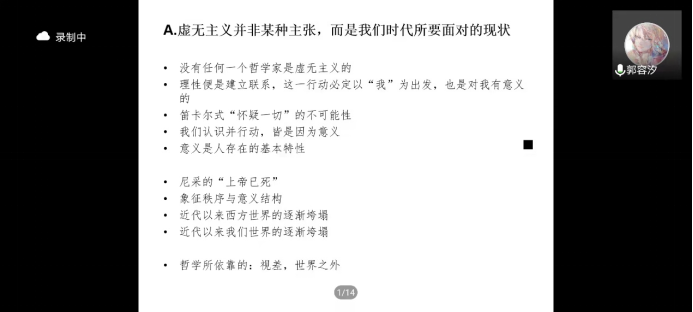 最后一位发言的同学是来自哲学与政府管理学院2019级哲学系新文科班的郭容汐。他从虚无主义的定义及现代的虚无主义、批判现代的虚无主义来探究虚无主义背后的原因并描述虚无的表现、虚无主义与相对主义的区别以及如何避免虚无感的方法