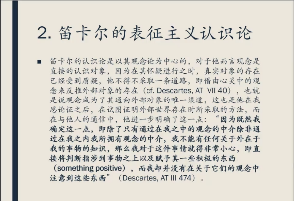 对于这个挑战,叶老师从两个方面进行了回答。一方面是笛卡尔的形而上学视角。他将外物与观念关系的确定性建立在上帝的保证 (即上帝不可能是个骗子)上,从而使得观念获得了通向外部世界的可靠的出口 ( Zugang) 。也就是说,对于笛卡尔而言,即使观念构成了某种障碍,依然存在着那个作为无限者的上帝,而正是他的介入使得这种障碍至少在笛卡尔那里并不能构成怀疑外部世界的根据。另一方面则是笛卡尔的生理学视角。对于笛卡尔而言,在认知时人总是处在与外部事物的某种直接接触之中,而由这种接触带来的在松果腺上的东西,只有借助于天赋观念人才最终实现了对该事物的认知。在这里,观念并不是某种障碍,相反它是某种工具,正是在它的帮助之下,人才能够实现对外部世界的认知,也就是说,我们是在与对象的直接接触之中,借助了观念从而实现了认知,这里也并没有上述怀疑主义能够发挥的空间。
