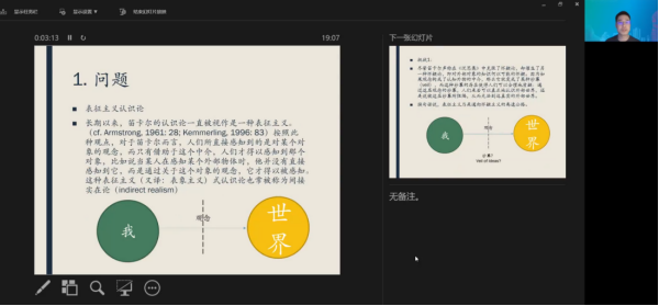 叶老师试图通过阐明围绕上述解释的 “观念” 这一核心概念尝试解决这场争论。首先展示了传统解释中的表征主义,即为什么笛卡尔一般被理解为表征主义者; 其次分析上述两种直接实在论,并揭示其内在的问题,另外尽管他们尝试通过不同的进路来挽救笛卡尔的认识论,但是忽视了笛卡尔文本可能给出的解释; 最后借助笛卡尔相关的哲学文本,通过对观念及其相关本体论问题进行分析从而论证笛卡尔的认识论乃是一种表征主义,同时回应上述两种挑战。